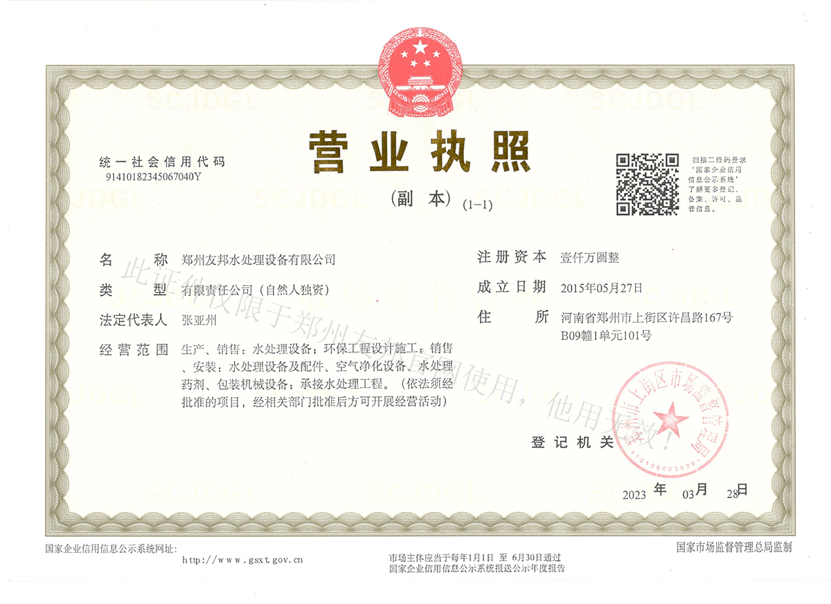 鄭州友邦水處理設備有限公司——營業執照