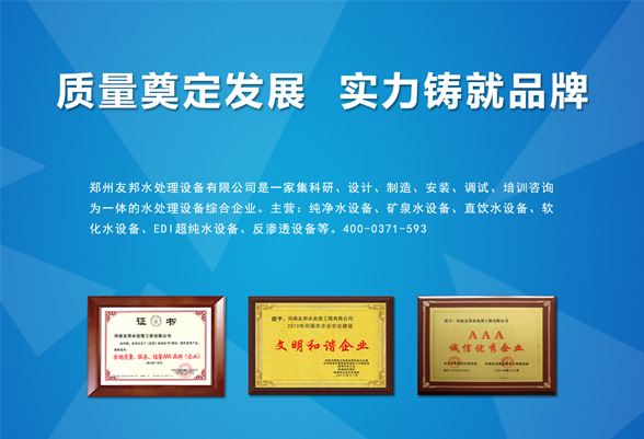 鄭州友邦水處理設備有限公司始創于2003年。自成立以來,友邦始終堅持以“客戶利益為保障”的原則,打造友邦口碑,備受客戶的認可和信賴。鄭州友邦是一家專業從事水處理技術開發,設備制造生產及銷售的企業公司。嚴格的生產管理系統環環相扣,層層把關。從原材料選購到現場調試安裝,鄭州友邦重視每個細節。公司以堅持技術創新、質量創優、服務創佳的原則,以優質的產品和專業的服務實現我們的承諾:把您擁有的水變成您需要的水!