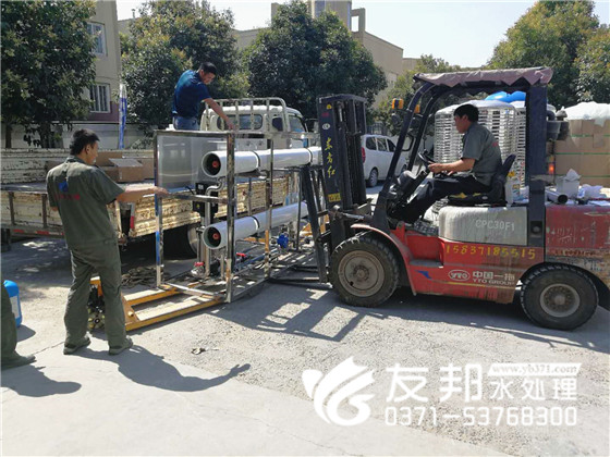 這套型號為YB-CJS-005,每小時出水5噸的單級水處理設備是發往新鄉的,工人們冒著炎炎夏日正在裝車發貨。