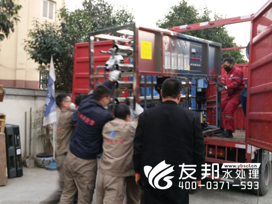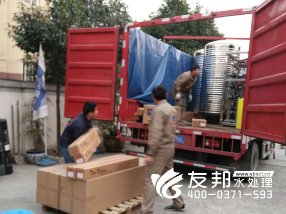 師傅們正在裝車發(fā)貨的是鄭州友邦生產(chǎn)的型號為YB-CJS-002的2噸純凈水設備。這套設備是用在鄭州高新區(qū)機械廠的生產(chǎn)用水。
