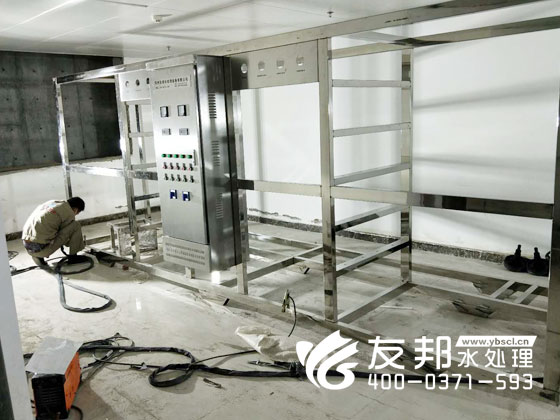 如圖以下就是鄭州友邦師傅們在嘉禾國際酒店正在組裝,安裝設備的圖片。這套設備有48大支RO反滲透膜組成,具有安裝調試方便,運行穩定,自動化程度高等特點。