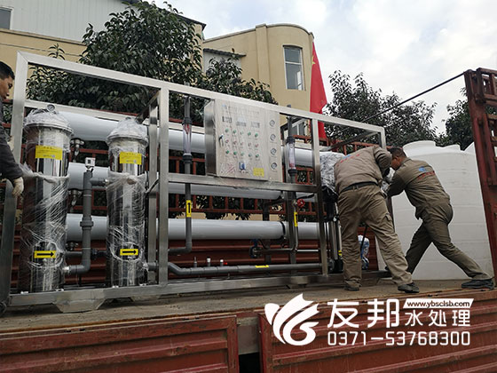 原水→原水箱→原水增壓泵→石英砂過濾器→活性炭過濾器→阻垢劑投加設備→精密過濾器→一級高壓泵→一級反滲透主機→中間水箱→二級高壓泵→二級反滲透主機→生產用水